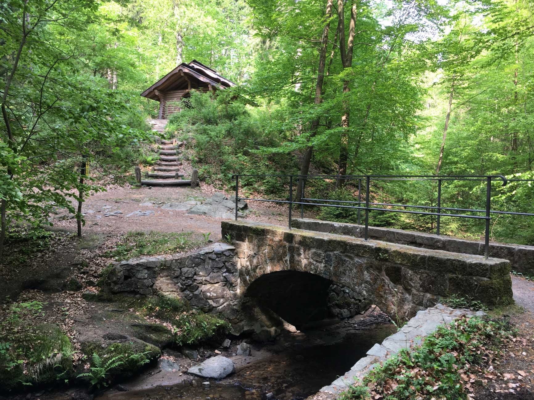 - Bergmannsbrücke am Wasserfall mit Schutzhütte im Hintergrund